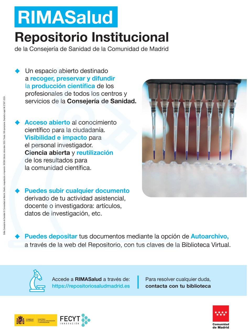 RIMASalud es el Repositorio Institucional de la Consejería de Sanidad de la Comunidad de Madrid y se erige como un espacio digital abierto donde se recoge, preserva y pone a disposición de cualquier persona interesada la producción científica generada por los profesionales de todos los centros y servicios de la Consejería de Sanidad como resultado de su actividad asistencial, investigadora y docente, garantizando así su conservación y acceso abierto y fomentando su visibilidad y difusión.